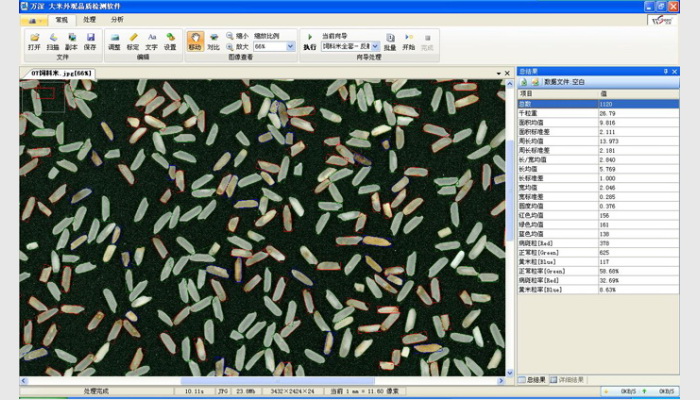 3、自動(dòng)測(cè)量每粒的面積、長(zhǎng)徑、短徑、長(zhǎng)寬比、圓度、等效直徑(長(zhǎng)度測(cè)量誤差≤±0.05mm,長(zhǎng)寬比測(cè)量誤差≤±0.05,重現(xiàn)性誤差≤±0.02;整精米率、碎米率指標(biāo)測(cè)量誤差≤±1.0%、重現(xiàn)性誤差≤±0.25%)。