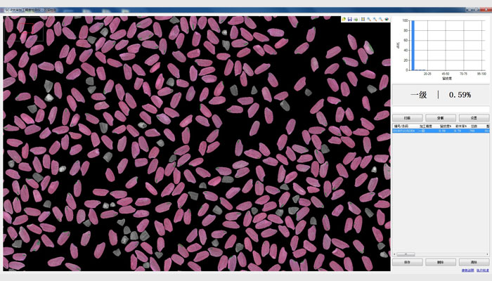 5、多樣的檢測報告直接顯示:留皮度判定結(jié)果、留皮度分布直方圖、完整粒分類(整精米率)、碎米率。分析報告輸出數(shù)據(jù)項可選,可在Excel軟件中進一步統(tǒng)計分析數(shù)據(jù)。