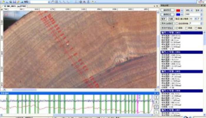 (1)可自動判讀年輪數、各年輪平均寬度、早材及晚材寬度、各年輪切向角度和面積、可自動劃分出年輪邊界、早材邊界、晚材邊界,以及識別出很窄的樹輪??山换h除偽年輪、插入斷年輪,