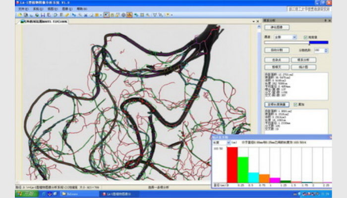 (11)能進(jìn)行根系的顏色分析,確定出根系存活數(shù)量,輸出不同顏色根系的直徑、長度、投影面積、表面積、體積。