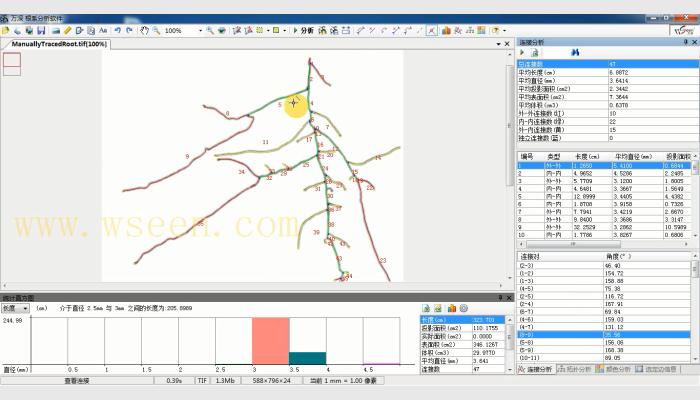 (12)能進(jìn)行根系的拓?fù)浞治?,自?dòng)確定根的連接數(shù)、關(guān)系角等,還能單獨(dú)地自動(dòng)分析主根或任意一支側(cè)根的長度和分叉數(shù)等,可單獨(dú)顯示標(biāo)記根系的任意直徑段相應(yīng)各參數(shù)(分檔數(shù)、檔直徑范圍任意可改,可不等間距地自定義),并能進(jìn)行根的分叉裁剪、合并、連接等修正,修正操作能回退,以快速獲得100%正確的結(jié)果。
